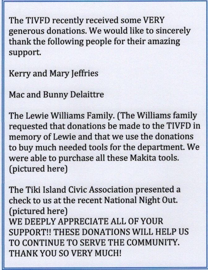 As always, we wish to thank you all for your support as we strive to protect and serve Tiki Island.